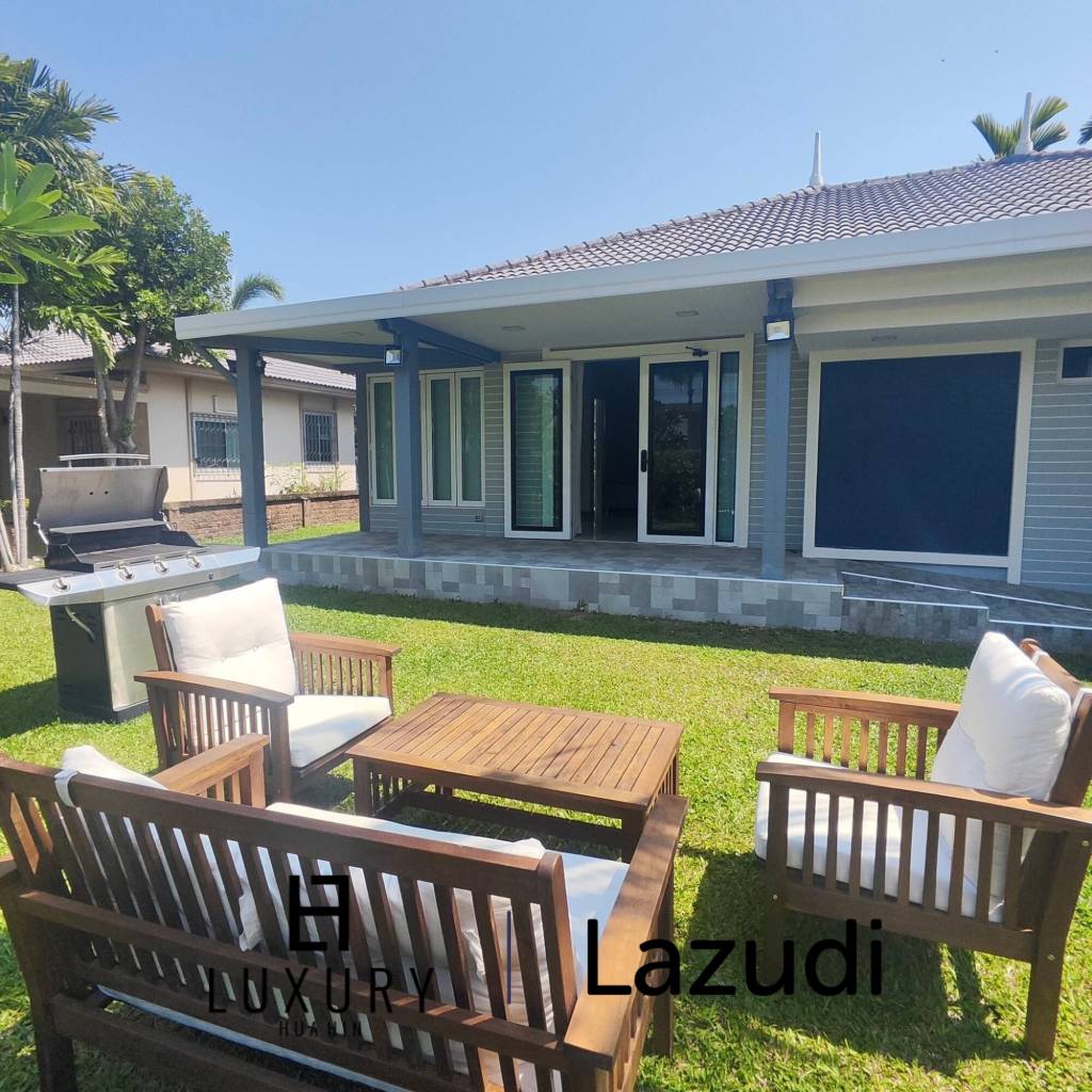 This modern detached pool villa in Cha Am, Phetchaburi offers 185 sqm of stylish single-story living. The home presents a bright open-plan layout with generous interiors, two bedrooms, and two bathrooms. It is fully furnished and ready for immediate use.