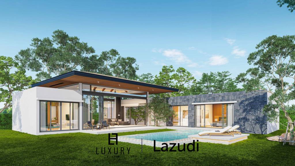 The villa provides an interior size of 350 sqm and a land size of 501.42 sqm. The layout includes 3 bedrooms and 4 bathrooms for comfortable everyday living. A private swimming pool forms the heart of the home and is framed by a poolside terrace and green lawn. Large floor-to-ceiling glass windows and sliding glass doors create a strong sense of indoor-outdoor connection. The single-story design includes an open-plan living and dining area and a separate kitchen space. The primary bedroom enjoys an en-suite bathroom for added privacy. The villa is offered with no furnishing, giving buyers freedom to design interiors to their own taste. Ownership is available as freehold or leasehold, providing flexible options.